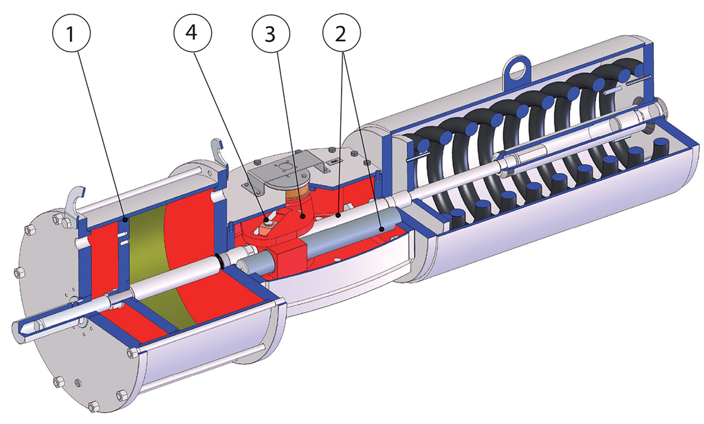 3 System motion conversion from linear to rotary separated from the piloting fluid of the actuator.
